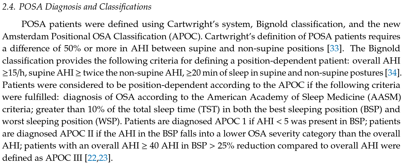 APOC-3: Esta categoria inclui pacientes com AOS que é menos dependente da posição. O IAH em posição supina é maior do que em posições não supinas, mas a diferença não é tão pronunciada quanto nas categorias APOC1 e APOC2. Pacientes nesta categoria podem ter uma resposta menos previsível à terapia posicional e podem necessitar de outras formas de tratamento, como CPAP.